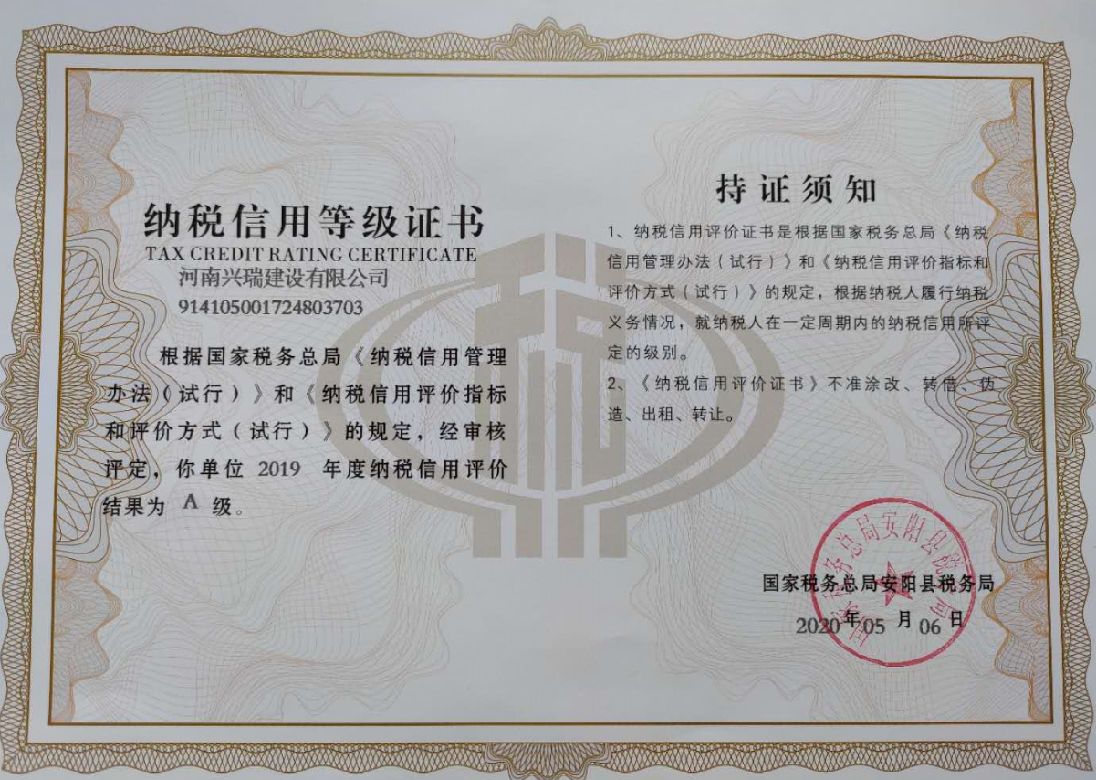 近日,公司被國家稅務總局安陽縣稅務局評定為2019年度納稅信用等級A 級企業(yè)。這是公司連續(xù)兩年獲納稅信用等級“A 級”評定,也是對公司近年來在依法納稅方面各項工作的充分肯定。