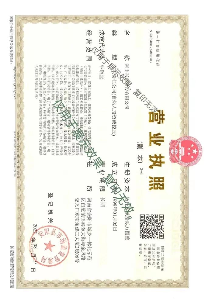 為契合公司發(fā)展戰(zhàn)略及經(jīng)營發(fā)展需要,河南興瑞建設(shè)有限公司于2022年8月19日完成了工商變更登記手續(xù),并換發(fā)了新的《營業(yè)執(zhí)照》。