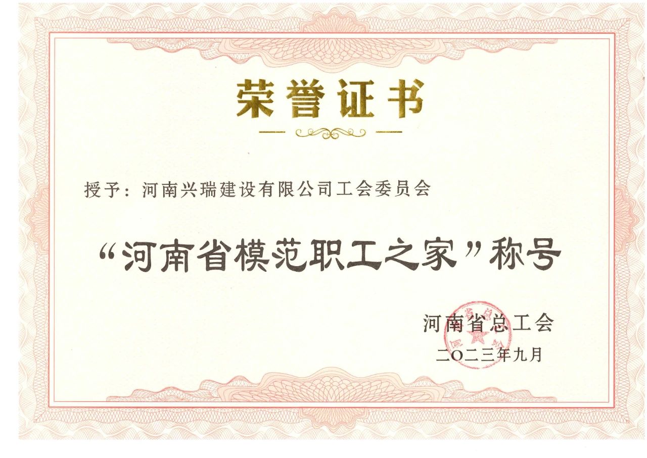 2023年9月11日,河南省總工會下發(fā)了《河南省總工會關(guān)于命名河南省模范職工之家、河南省模范職工小家、河南省優(yōu) 秀工會工作者、河南省優(yōu) 秀工會積極分子、河南省優(yōu) 秀工會之友的決定》(豫工發(fā)【2023】7號)。河南興瑞建設(shè)有限公司工會委員會榮獲“河南省模范職工之家”榮譽稱號。