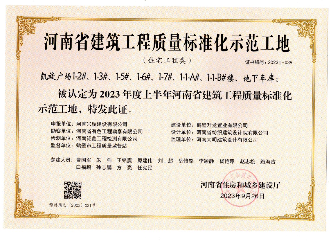 近日,鶴壁凱旋廣場項目榮獲“河南省建筑工程質量標準化示范工地”稱號。該榮譽稱號由河南省住房和城鄉(xiāng)建設廳主導設立,旨在充分發(fā)揮質量管理標準化先進典型示范引領作用,全面提升工程質量水平。該榮譽每年評選兩次,自2020年設立至今已評選六屆。