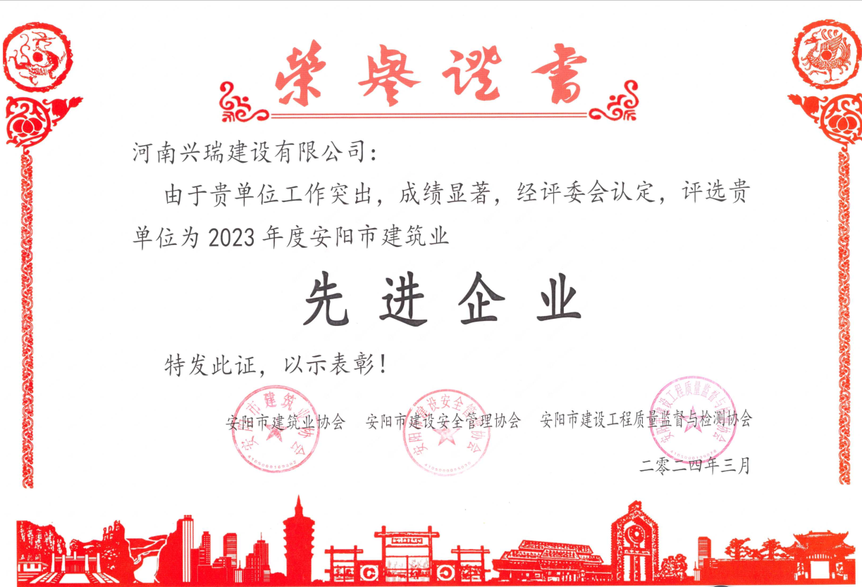 近日,安陽(yáng)市建筑業(yè)協(xié)會(huì)對(duì)2023年度先進(jìn)企業(yè)和優(yōu) 秀項(xiàng)目經(jīng)理進(jìn)行了表彰,河南興瑞公司榮獲2023年度安陽(yáng)市建筑業(yè)“先進(jìn)企業(yè)”和“安全管理先進(jìn)企業(yè)”,李振、郭計(jì)清、呂明潔、張玲玲等6人榮獲2023年度安陽(yáng)市建筑業(yè)“優(yōu) 秀項(xiàng)目經(jīng)理”。